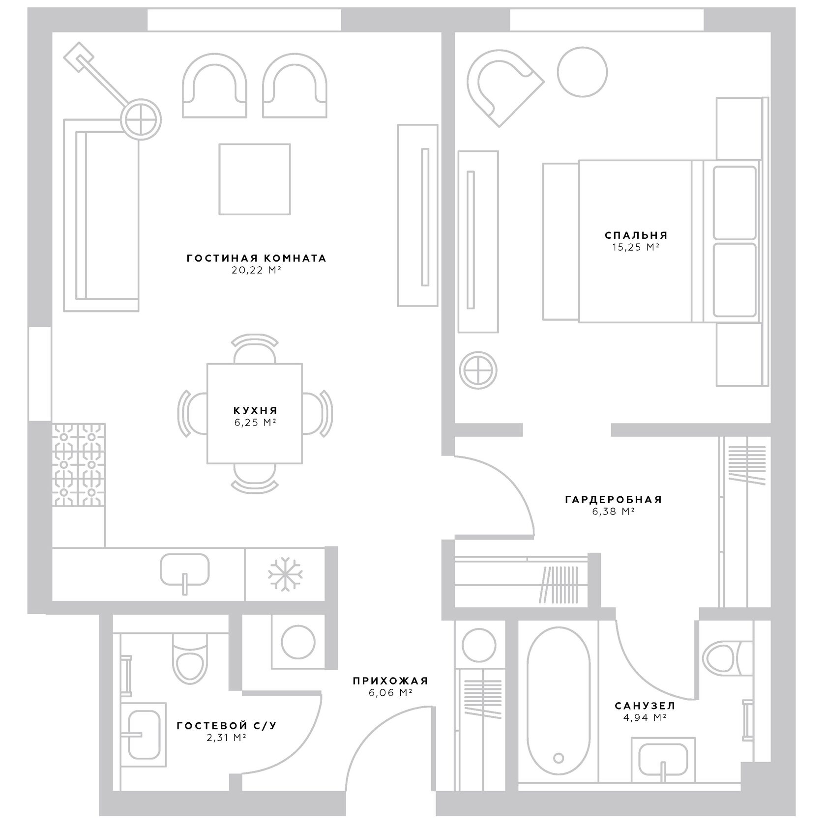 61 м2 | 7 этаж |1 спальня | 2 ванные комнаты