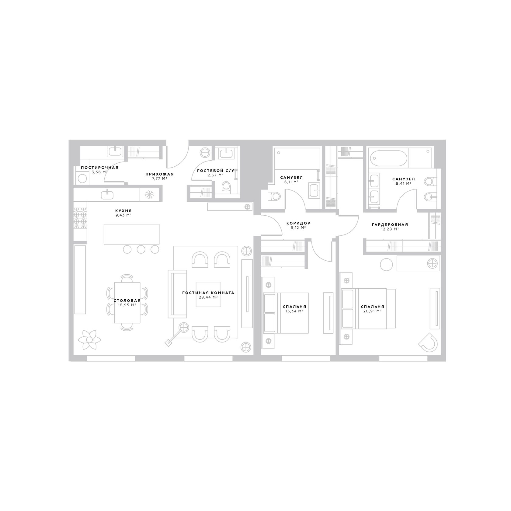 Площадь 138,69 м2 | этаж 7 | 2 спальни | 3 ванные комнаты