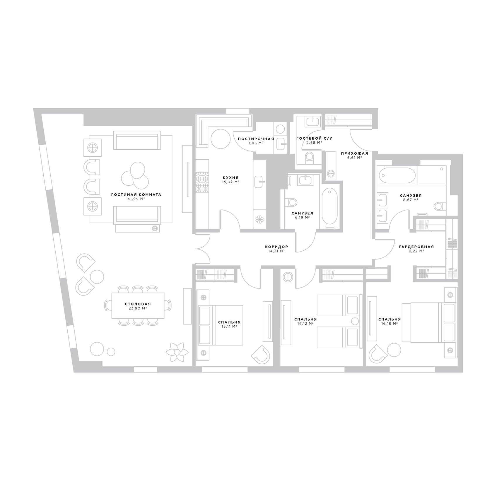 Функциональной планировкой предусмотрена гостиная, кухня-столовая, мастер-спальня с ванной комнатой и гардеробной, гостевой санузел, постирочная. Окна выходят на две стороны: район Хамовники, тихий благоустроенный двор.