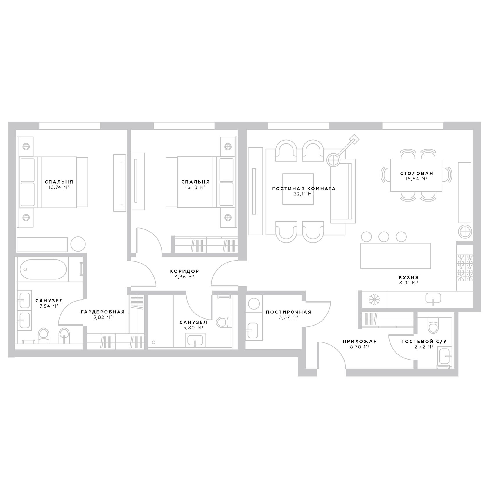 Функциональной планировкой предусмотрена гостиная, кухня-столовая, мастер-спальня с ванной комнатой и гардеробной, гостевой санузел, постирочная. Окна выходят на две стороны: район Хамовники, тихий благоустроенный двор.